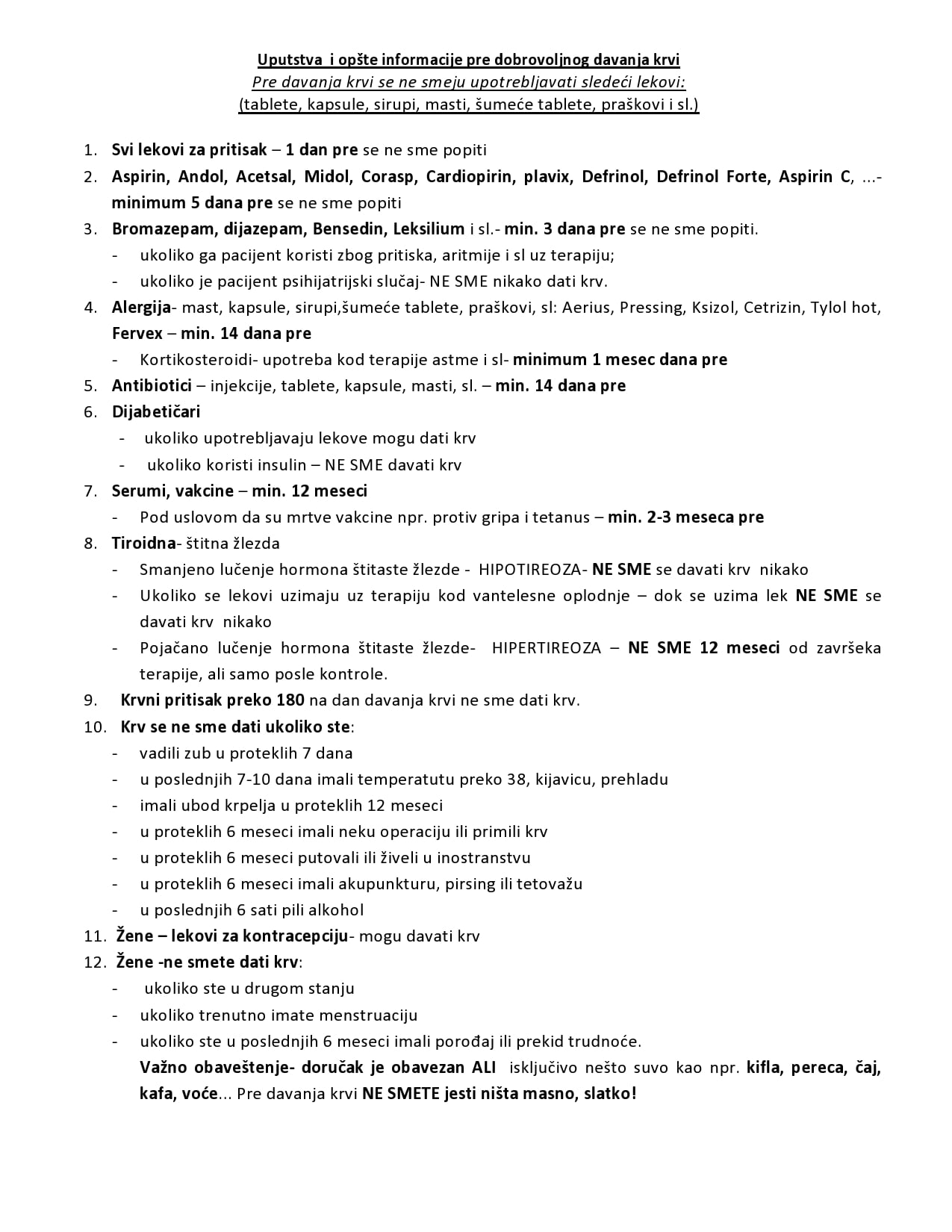 na dan održavanja akcije dobrovoljnog davanja krvi postavlja se dezo barijera, održava se distanca od 1,5 m između svih učesnika akacije i vrši se dezinfekcija ruku svih učesnika akcije