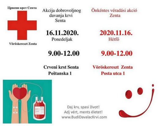 Akcija davanja krvi u Crvenoom krstu Senta biće održana 16.11.2020. u terminu od 9,00 do 12,00 u prostorijama Crvenog krsta Senta.
